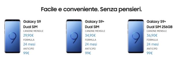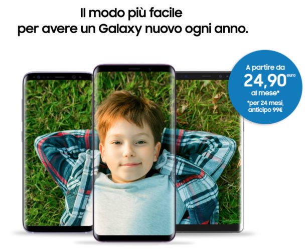 L’offerta è attualmente disponibile su Samsung.com. Per attivare il servizio è sufficiente seguire le indicazioni presenti sul sito per scegliere quale smartphone “noleggiare” e scoprire le condizioni contrattuali: per esempio, per il nuovo Samsung Galaxy S9 basterà pagare un contributo iniziale di 99 euro e successivamente rate mensili da 29,90 euro, meno di un caffè al giorno per uno smartphone che non teme confronti.