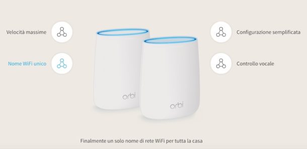 Router WiFi Tri-Band Mesh AC2200 che garantisce una copertura fino a 100 mq ed è il punto di partenza per la creazione del sistema wifi. La rete wireless può essere comodamente gestita con i servizi vocali Alexa e Google. Consente il collegamento di più dispositivi contemporaneamente senza compromettere la velocità e la stabilità. Per rendere l’accesso alla rete ancora più sicuro per i più piccoli il kit include la funzionalità Smart Parental Control Circle di Disney. Compatibile con i modem di qualsiasi operatore e l’installazione semplice in tre fasi con l’utilizzo dell’App Orbi.