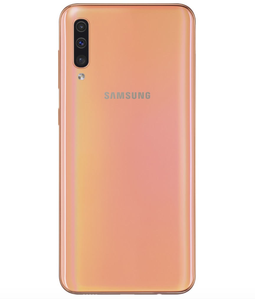 Galaxy A70 sarà disponibile da fine aprile nelle colorazioni black, blue, white e coral al prezzo di 419€.