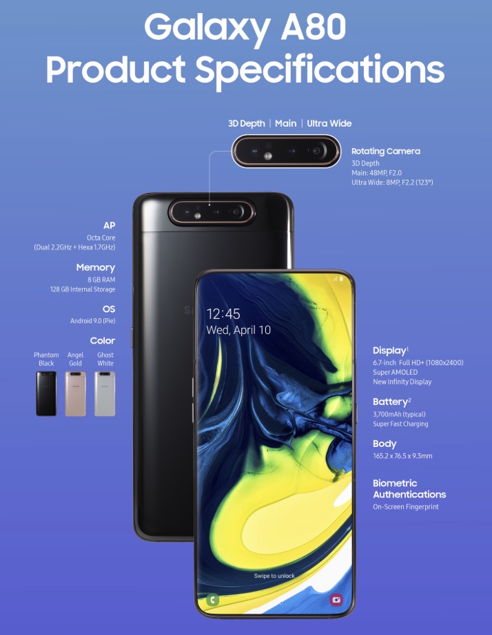 Galaxy A80 sarà disponibile da giugno nelle colorazioni Phantom Black, Angel Gold e Ghost White al prezzo di 679€.