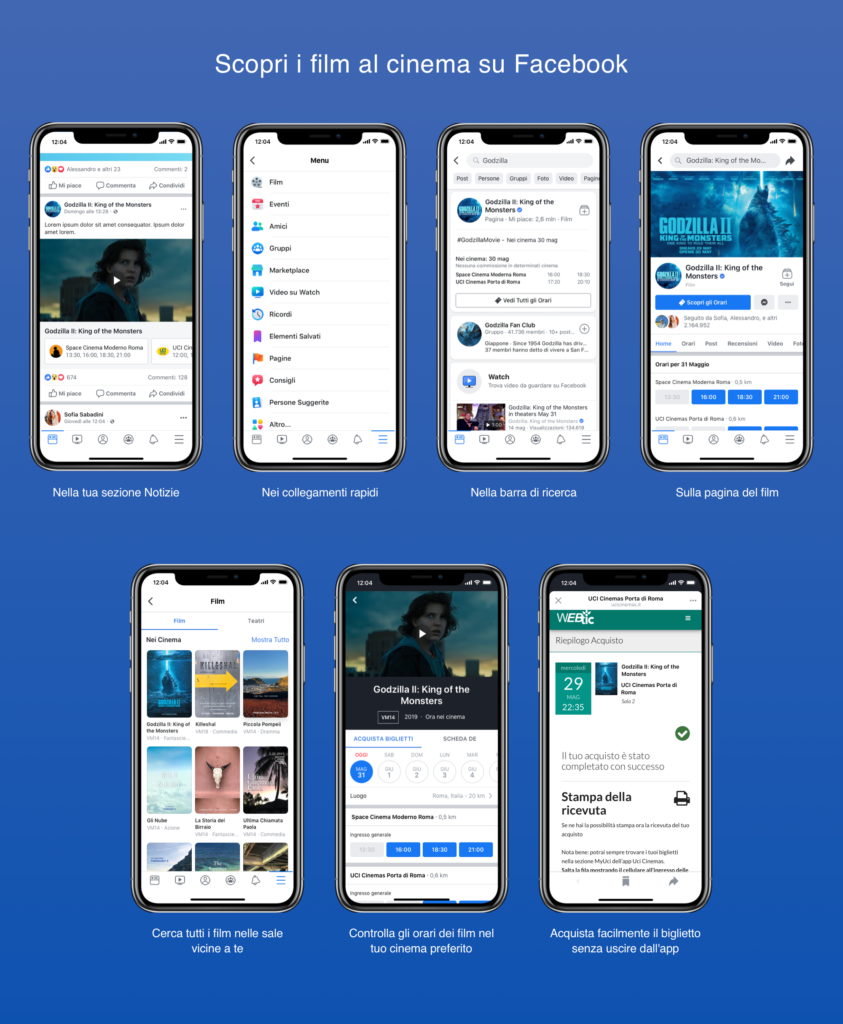 Per provare Film è sufficiente accedere al menu generale di Facebook e selezionare l’icona con l’immagine di una bobina cinematografica. A quel punto appariranno due sezioni: “Film”, con l’elenco degli spettacoli in programmazione, la descrizione, il trailer, tutte le informazioni su cast e regista e “Cinema”, con la lista delle sale, gli orari degli spettacoli e i link per acquistare il biglietto online.