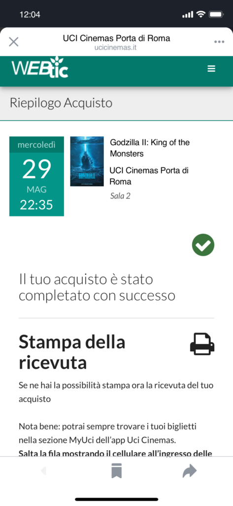 Una volta selezionati film e sala, i biglietti possono essere acquistati con un solo clic direttamente sul sito del cinema, dove disponibile l’e-commerce, sul quale viene effettuato il pagamento e completata la transazione. A fine procedura, il cinema invia all’acquirente una conferma via email con il codice a barre o il QR code dell’e-ticket, a seconda di quanto previsto dal sistema di e-commerce utilizzato.