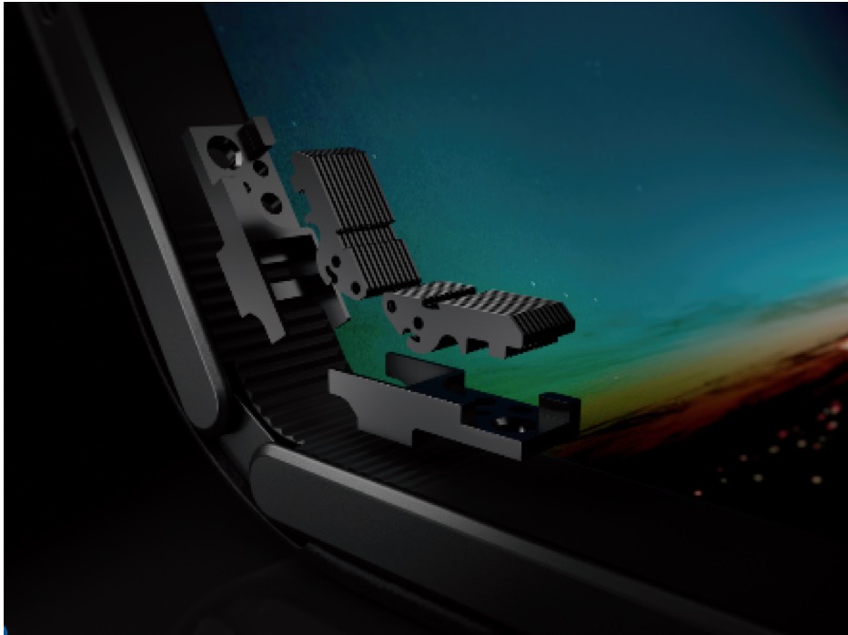 - Il meccanismo della cerniera, combinato con l’utilizzo di leghe leggere e rinforzi in fibra di carbonio, ottimizza l’esperienza visiva quando il dispositivo è aperto.
