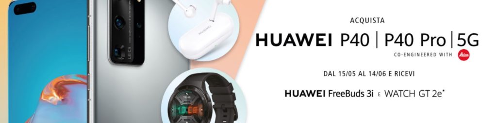 La promozione, valida dal 15 maggio al 14 giugno 2020 presso tutti i rivenditori aderenti all’iniziativa, permette a tutti coloro che acquisteranno HUAWEI P40 o HUAWEI P40 Pro di ricevere in regalo HUAWEI Freebuds 3i, del valore commerciale di 99,9 euro e HUAWEI Watch GT2e, del valore commerciale di 169,90 euro.