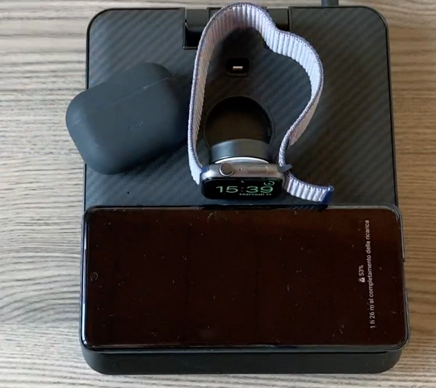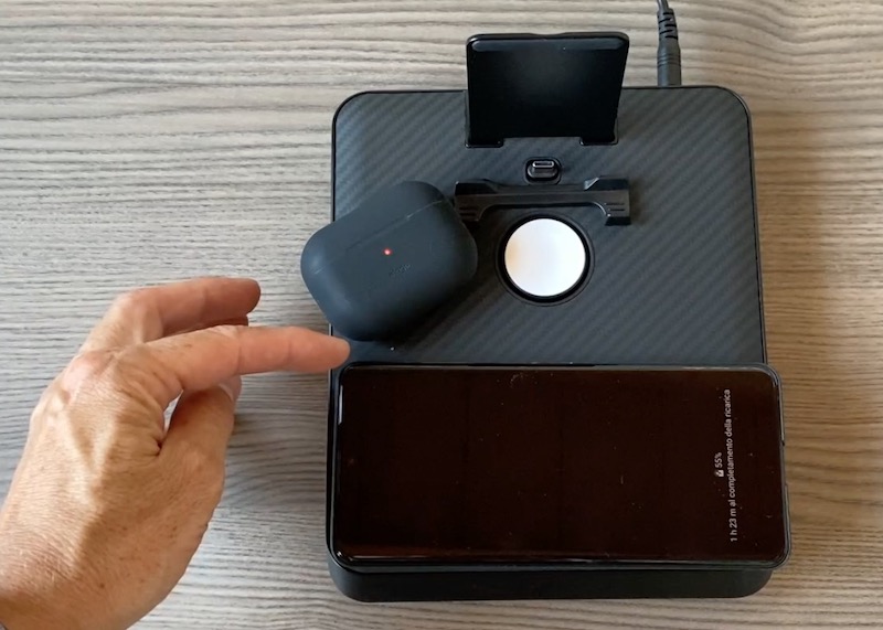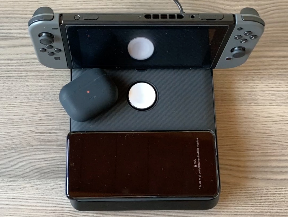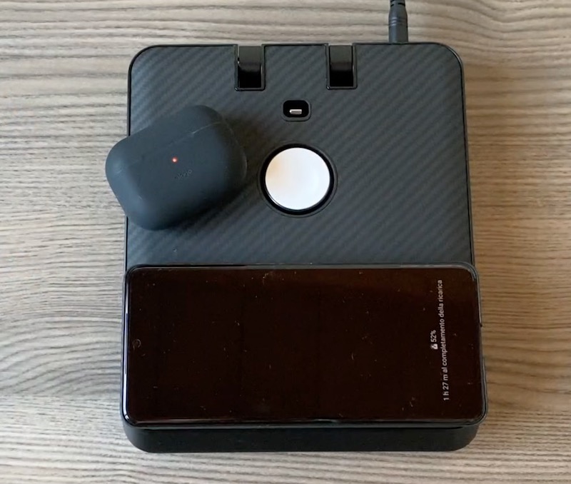 L’ho testato utilizzando tutte le porte occupate e con un iPhone 11 Pro MAX in carica wireless, le Airpods PRO, un Apple Watch e un iPad AIR, il Galaxy S20 ULTRA collegato via cavo Type C, si carica rapidamente.