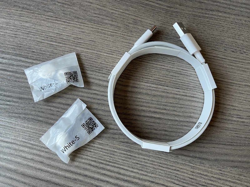 Nella confezione troviamo, oltre agli auricolari, il cavetto USB Type C per la ricarica, due paia di gommini in ear (S-L) e vari manuali di garanzia e istruzioni.