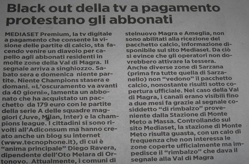 Leggi tuttoAncora oscurato il pacchetto Mediaset Premium Calcio per gli abbonati nei comuni di : Ortonovo, Sarzana, Castelnuovo, Fosdinivo, Arcola.