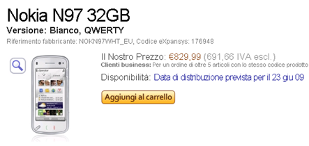 Anche il Nokia N97 appare sullo shop di TIM!! Il suo prezzo sarà di 599€ Nessuna informazione riguardo la disponibilità, ma possiamo iscriverci per ricevere notizie {IMU_120_600}