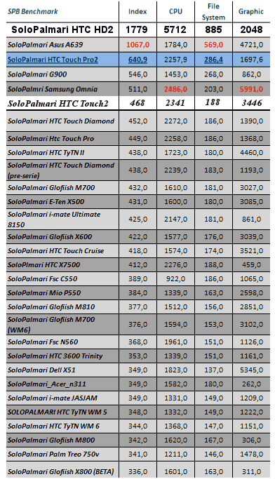 Chiaramente HD2 regna inconstrastato, mi sarebbe piaciuto sapere il benchmark del Toshiba TG01, terminale con il solito processore SnapDragon.