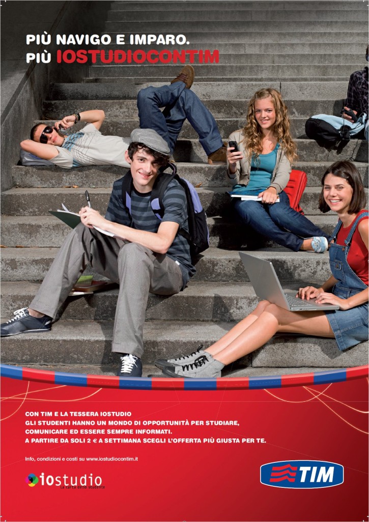 Io studio con TIM nasce per agevolare gli studenti nell’acquisto e utilizzo di servizi e prodotti di telecomunicazione, è rivolta a tutti gli studenti delle scuole superiori in possesso dellaCarta dello Studente (chi non ce l’ha può richiederla nella segreteria della propria scuola) e prevede ben cinque offerte per poter parlare, mandare sms, navigare in internet a prezzi molto vantaggiosi.