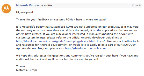 Pochi giorni fa, forse per calmare gli animi, Motorola aveva pubblicato una lettera aperta, dove spiegava che si sarebbe impegnata ad ascoltare le richieste degli utenti.