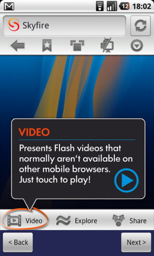 Il pulsante video vi permetterà di visualizzare i video in flash che normalmente il browser di Android non visualizza.