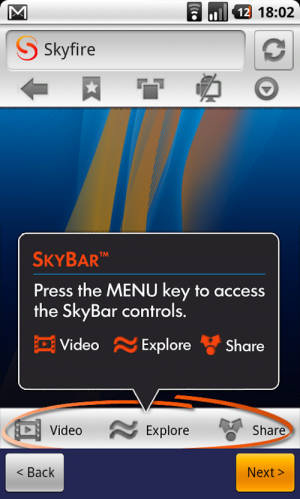 In basso vi è la SKy Bar con i pulsanti Video, Explore e Share