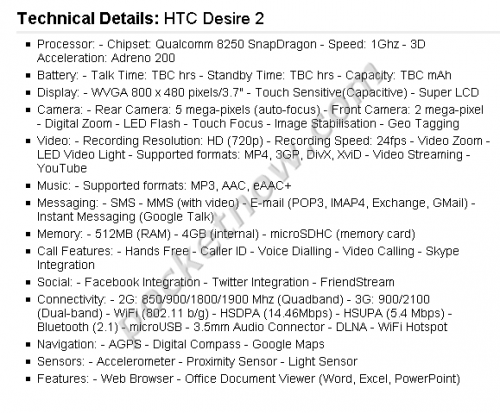 Samsung Galaxy S 2 e HTC Desire HD 2 passano al dual core Qualcomm da 1,2 Ghz, mentre HTC Desire 2 ha la versione da 1 Ghz.