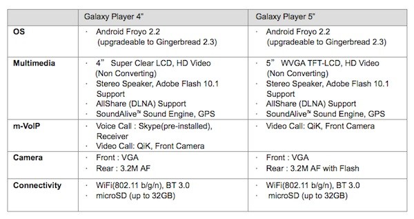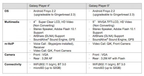 Il Galaxy Player arriverà sul mercato in primavera in due differenti versioni da 4 e 5 pollici. Entrambi i modelli saranno dotati di doppia fotocamera (3.2 Mpx posteriore e VGA anteriore) e saranno motorizzati da Android 2.2 Froyo (aggiornabile a Android 2.3 Gingerbread).