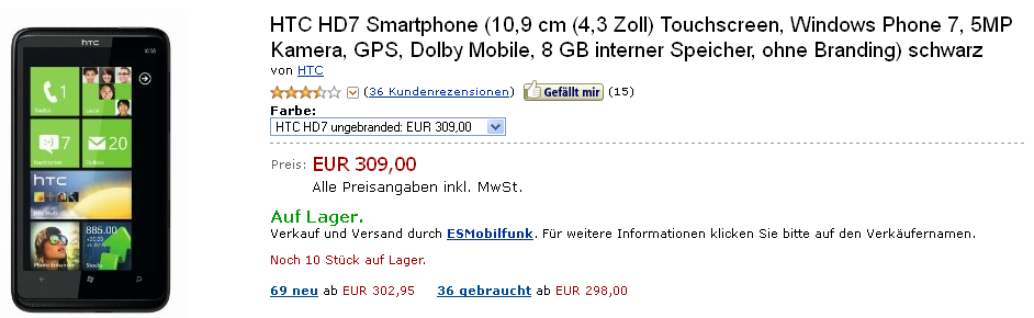 Tanto per farvi un’esempio, se siete interessati ad un’ HTC HD7 lo potete reperire su amazon.de a 309,00 €.