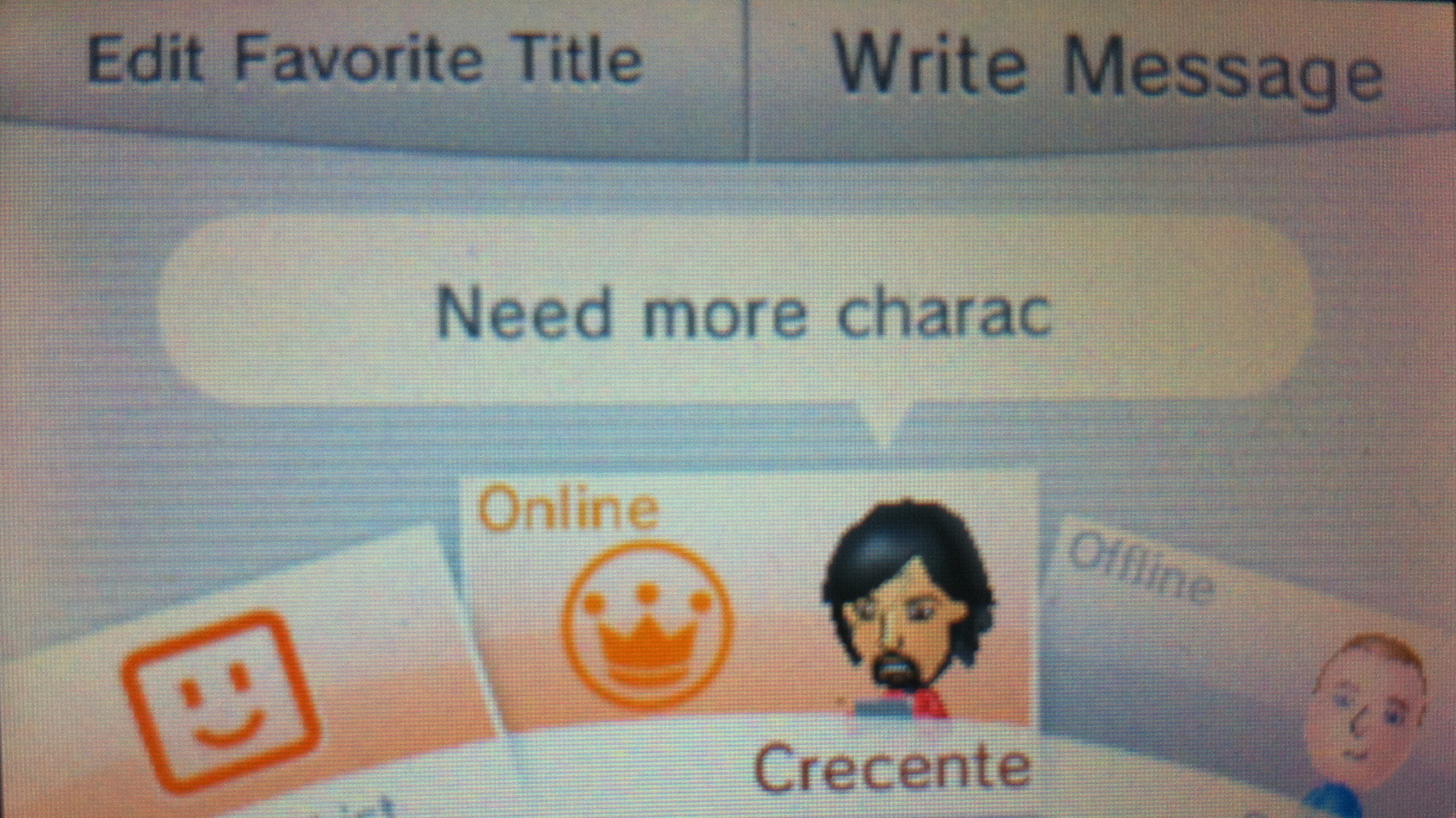 Come dice chiaramente il nome, con questa applicazione saremo in grado di creare i nostri Mii da zero. Per fare questo avremo a disposizione tantissimi modelli per ogni parte del nostro viso. Potremo infatti decidere la forma del volto, la forma dei capelli, il tipo, la forma e dimensione delle sopracciglia, lo stesso dicasi per gli occhi, il naso e la bocca. Potremo anche “abbellire” il nostro Mii con oggetti vari, come occhiali di varie forme e dimensioni, baffi,barbe, nei, ecc. Non poteva mancare, per finire, la possibilità di lasciare alla console l’iniziativa di creare il Mii partendo da una foto. Diciamo che l’animazione tramite la quale il Mii “estrae” il viso dalla foto è molto più carina del risultato. Ho provato con più foto infatti, ma il risultato non è dei migliori.