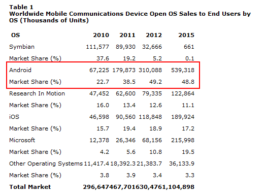Android ha già preso il controllo del mercato degli smartphone negli Usa, ma, secondo Gartner, entro la fine di quest’anno sarà il sistema operativo più popolare.