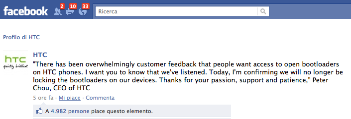 Peter Chou, il CEO di HTC, comuncia che da oggi il bootloader sui dispostivi HTC non sarà più bloccato!
