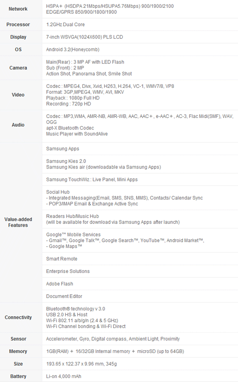 Il nuovo Galaxy Tab 7 Plus è ha un display da 7 pollici con risoluzione 1024×600. Il processore utilizzato è un