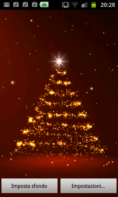 Albero di Natale scintillante su sfondo rosso, possibilità di visualizzare i giorni che mancano al Natale e altre animazioni nella versione a pagamento.