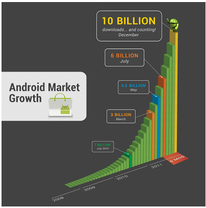 Lo scorso weekend, grazie agli utenti Android di tutto il mondo l’Android Market ha superato i 10 miliardi di app scaricate, registrando un tasso di crescita pari a 1 miliardo di download al mese.