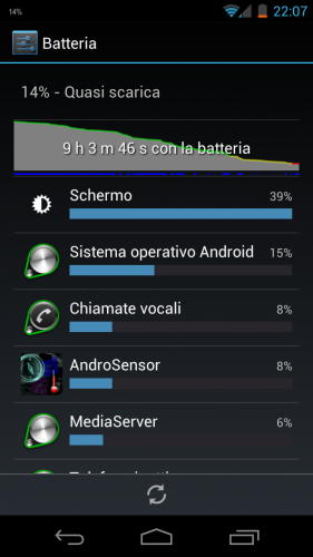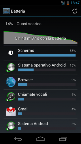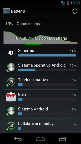 La batteria non mi sembra così miracolosa, fortunatamente si ricarica più velocemente grazie al carica batteria da 1 A (Nexus S e Galaxy S II si caricano a 700 mA)
