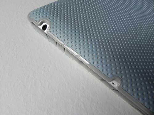 Una morbida eco pella traforata riveste la cover rigida di plastica ultra slim.
