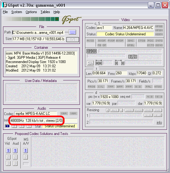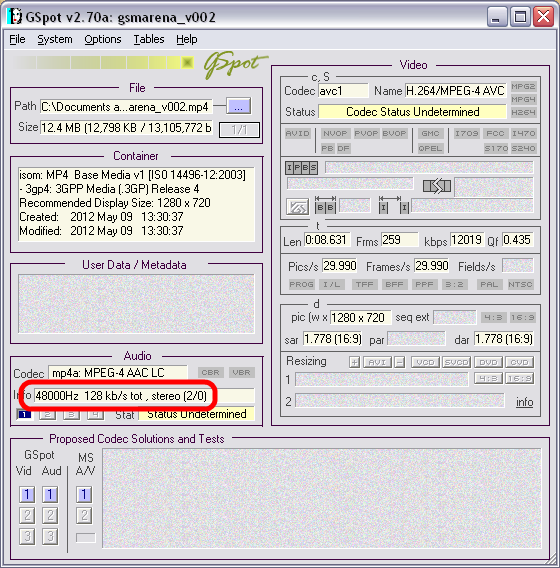 Con il programma GSpot possiamo notare infatti che sia nel video girato a 1080p sia in quello a 720p l’audio è registrato a 48kHz.