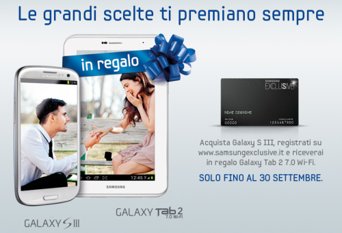 Tutti colori che acquisteranno lo smartphone nel periodo che va dal 25 Agosto al 30 Settembre 2012, riceveranno in omaggio un Samsung Galaxy tab 7 2,0 Wifi, dal valore di 200 euro.