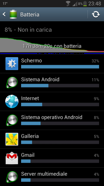 solo che oggi ho visto una diminuizione di batteria troppo veloce. sono le 5 e 30 quasi e ho il 23%. se vado su batteria (impostazioni) vedo che la voce “sistema android” è al 19%. come mai?? da cosa può dipendere?
