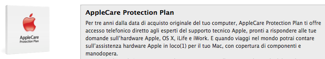 Dal 9 novembre 2012 Apple ha smesso di vendere nei negozi italiani il pacchetto AppleCare, optional che offriva un’estensione da 1 a due anni della garanzia del prodotto e da 90 giorni a 2 anni l’assistenza telefonica Apple. Tutto questo a causa delle dispute legali che hanno interessato l’azienda californiana in Italia contro l’Autorità Garante della Concorrenza e del Mercato, che impone al produttore di fornire una garanzia minima di due anni inclusa col prodotto, senza quindi costi aggiuntivi.