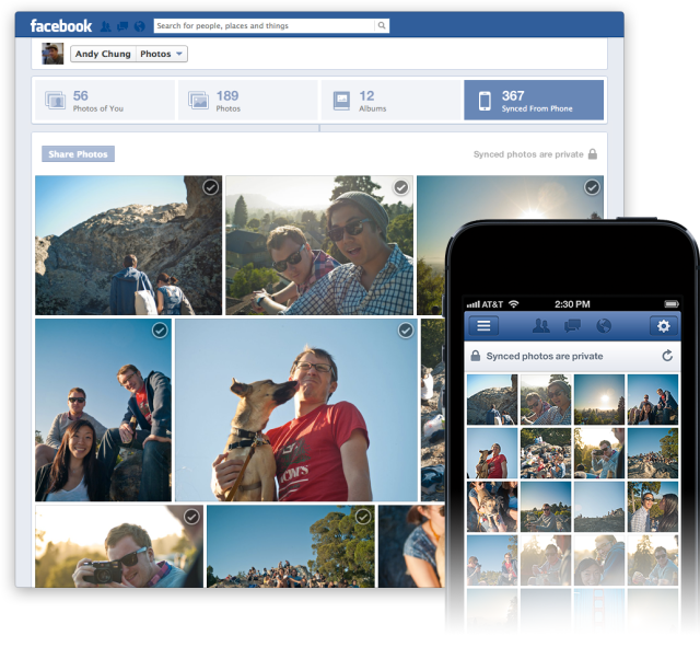 L’applicazione Facebook è in perenne aggiornamento; tra le ultime novità, tra cui il tanto atteso pulsante condividi – veramente Mark? tre anni? – è spuntata, solo per alcuni utenti, la possibilità di sincronizzare automaticamente le foto del Rullino in iOS con un album privato sul social network, dando quindi all’utente la possibilità di avere già le foto online casomai volesse pubblicarle con amici e parenti.
