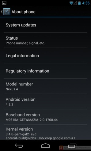Non solo in Brasile è stato avvistato un Nexus 4 (Miracolo? Allora li producono!) ma sembra proprio che a bordo avesse la versione 4.2.2 di Android a noi ancora sconosciuta. Vediamo qualche immagine: