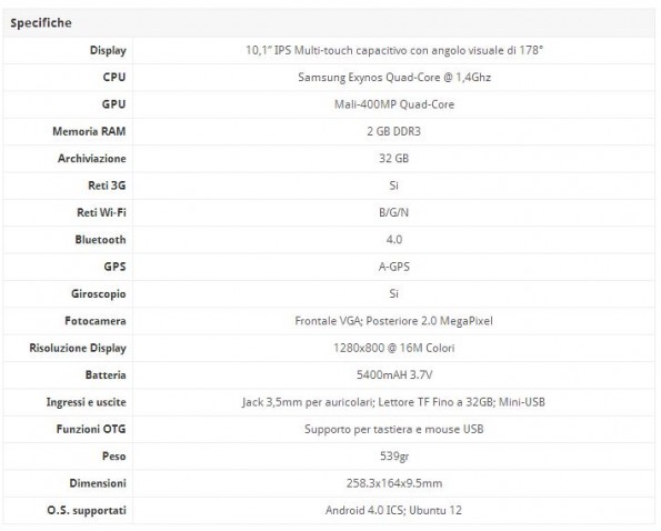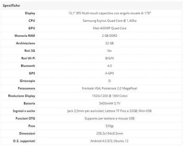 Come dicevo ad inizio articolo, hardware molto interessante. Notiamo innanzitutto il supporto ad Ubuntu 12, processore Exynos 4412 Quad-Core, 2Gb di Ram e Display Full HD/HD!