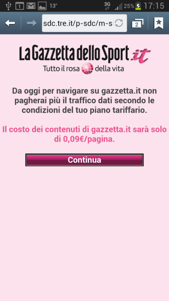 Succede se vi collegate con il vostro smartphone sotto rete 3 al sito della gazzetta. Il sito è a pagamento, però si viene prima avvisati, come testimonia il seguente screenshot.