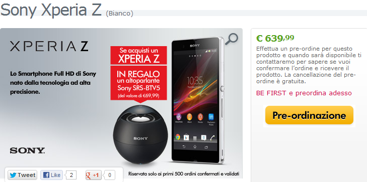 Ai primi 500 clienti che preordineranno e confermeranno l’ordine del Sony Xperia Z sarà regalato un altroparlante Sony del valore di circa 70€!
