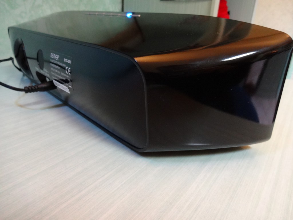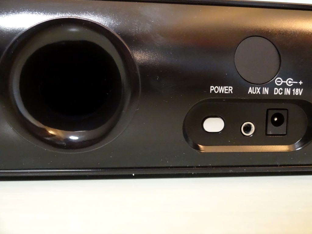 Nel retro troviamo il foro per i bassi, il tasto di accensione, l’entrata Aux-in per collegare i nostri dispositivi non bluetooth (pc,mp3 ecc) e l’entrata per l’adattatore da parete.