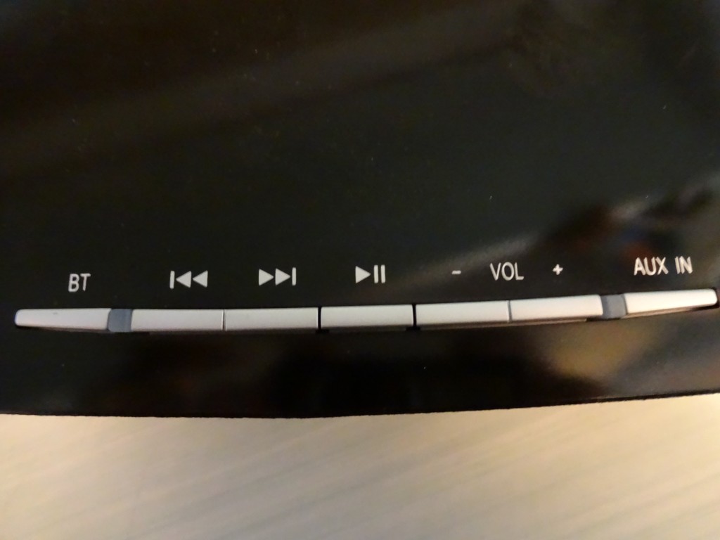 Sopra troviamo: il tasto del Bluetooth con led multicolore dedicato (per segnalarci l’avvenuto accoppiamento con il dispositivo), i tasti per passare alla prossima canzone o a quella precedente, il tasto pausa/play, i tasti per il volume ed il tasto dedicato all’Aux-in (anche lui con led di stato)