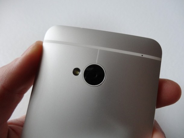 Nel retro abbiamo la fotocamera Ultrapixel con il flash a led. La righetta bianca è l’ antenna integrata, il forellino di destra è il secondo microfono.