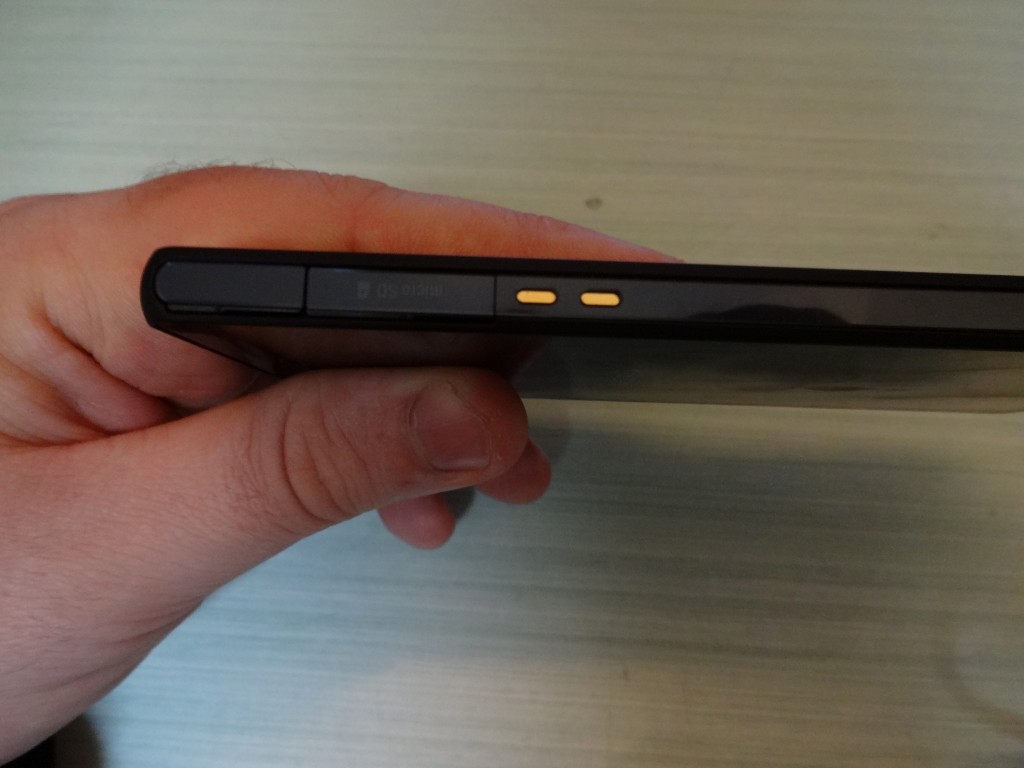 Nel profilo destro troviamo la cassa altoparlante, il bilanciere del volume, il tasto di accensione e spegnimento e lo sportellino contenente la nostra micro sim