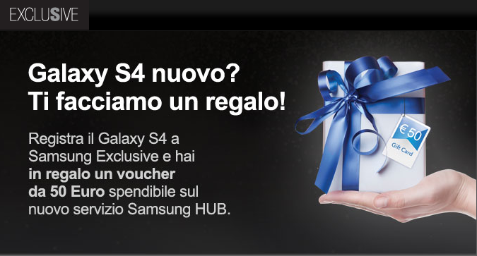 Ecco a voi una nuova promozione per tutti i possessori di Samsung Galaxy S4 Italia, vi basterà infatti registrarlo al sito Samsung Exclusive per avere diritto a 50€ di buono spendibile sul Samsung Hub per film, serie tv, ebook e giochi.