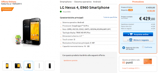 Qualche giorno fa vi ho segnalato in questo articolo l’inserimento del “nuovo” LG Nexus 4 garanzia Italia presso Marcopolo Expert anche se in realtà il prodotto non era ancora disponibile, non lo era fino ad oggi! Se siete infatti interessati all’acquisto lo trovate ora disponibile a 429€!