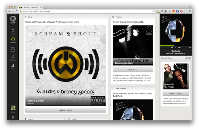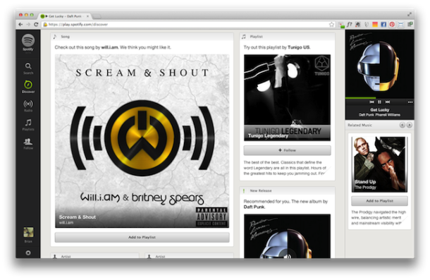 La pagina “Scopri” è disponibile da oggi sul nuovo web player, uno strumento in più per accedere a Spotify se non si ha la possibilità di utilizzare la app sul proprio desktop. Così anche in ufficio o a casa di un amico, basterà effettuare il login con il proprio account e premere play per ascoltare musica. Per provare “Scopri” sul web player di Spotify, basta collegarsi a http://www.spotify.com.