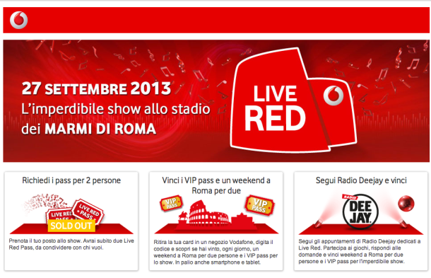 Fino al 15 settembre, tutti coloro che porteranno il proprio numero in Vodafone e i già clienti che effettueranno una ricarica di almeno 20 euro, o che attiveranno un abbonamento RELAX o un abbonamento ADSL nei negozi vodafone, riceveranno una card con un codice. Inserendolo nell’apposita sezione del sito http://livered.vodafone.it parteciperanno all’estrazione di smartphone e tablet Vodafone e di un weekend a Roma per due persone, con Vip Pass per lo show “Live Red” del 27 settembre.