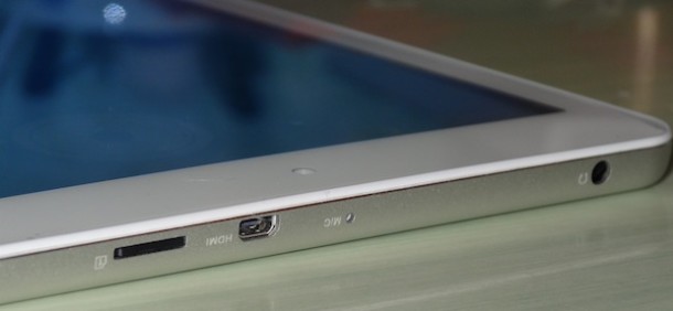 Sopra troviamo l’ingresso Micro SD per espandere la memoria fino a 32 GB, ingresso Micro HDMI per collegare il dispositivo alla vostra TV, microfono e Jack da 3,5 millimetri per gli auricolari.