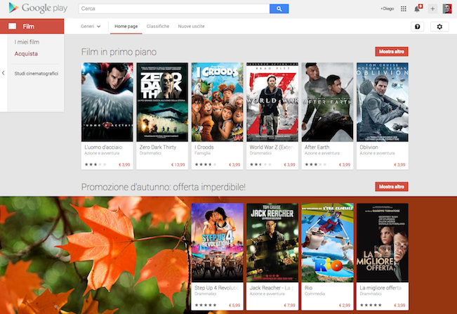 A partire da oggi, gli utenti italiani potranno noleggiare o acquistare (in alta definizione o in definizione standard) i film in uscita tratti dai cataloghi dei principali studi cinematografici internazionali, come NBCUniversal, Paramount Pictures, Warner Bros, Sony Pictures Home Entertainment, The Walt Disney Company e Twentieth Century Fox. Inoltre, a questi si aggiungono numerosi titoli distribuiti dalle principali case indipendenti italiane, quali CG Home Video, Lucky Red, Eagle Pictures, BiM Distribuzione, Luce – Cinecittà, Moviemax, M2 Pictures, Dall’Angelo Pictures e Videa.Google Play dà accesso a tantissimi film, dai classici alle ultime uscite, tanto per acquisto quanto per noleggio. Alcuni esempi dei titoli disponibili già in fase di lancio: