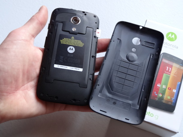 Moto G ha un display da 4,5 pollici HD, un processore quadcore Snapdragon 400 da 1,2 Ghz con 1 Gb di Ram, la memoria interna da 8 GB non espandibile, la fotocamera nel retro da 5 Megapixel e una batteria non removibile da 2070 mAh.