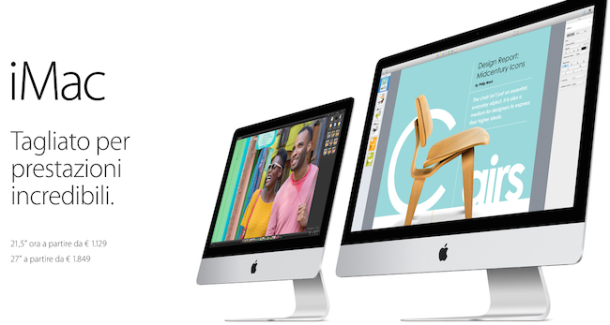 Apple introduce il nuovo iMac entry-level da 21,5″. Il miglior desktop all-in-one al mondo ora a partire da €1129CUPERTINO, California—18 giugno 2014—Apple ha presentato oggi un nuovo modello di iMac da 21,5″ che parte da €1129, rendendo così il desktop all-in-one migliore al mondo, più conveniente che mai. Con un meraviglioso design ultra-sottile, un display brillante, processori Core i5 e il sistema operativo più evoluto al mondo, il nuovo iMac è il perfetto desktop Mac entry-level.Il nuovo iMac da 21,5″ è dotato di processore Intel Core i5 dual-core a 1,4GHz con velocità Turbo Boost fino a 2,7GHz, grafica Intel HD 5000, 8GB di memoria e un disco rigido da 500GB. Tutti i modelli includono inoltre Wi-Fi 802.11ac di prossima generazione, oltre a due porte Thunderbolt e quattro porte USB 3.0 garantendo un’eccellente capacità di espansione e il massimo supporto per le periferiche ad alte prestazioni.Le suite iLife e iWork sono di serie su tutti i nuovi Mac. Con iLife è possibile montare video in iMovie, creare musica o imparare a suonare il piano o la chitarra con GarageBand, e organizzare, modificare e condividere gli scatti più belli con iPhoto. Con le app per la produttività della suite iWork – Pages, Numbers e Keynote – è facile creare, modificare e condividere fantastici documenti, fogli di calcolo e presentazioni. E con la versione beta di iWork per iCloud è possibile creare un documento sull’iPad, modificarlo sul Mac e persino collaborare con amici e colleghi che usano un PC.Ogni Mac ha di serie OS X, il sistema operativo più evoluto al mondo, progettato all’insegna della massima semplicità d’uso sfruttando al meglio tutte le potenti tecnologie integrate in ogni Mac. All’inizio di giugno, Apple ha annunciato OS X Yosemite, una nuova potente versione di OS X ridisegnata e raffinata con un look fresco e moderno, nuove potenti applicazioni e nuove sorprendenti funzioni di continuità che rendono il lavoro sul Mac e sui dispositivi iOS più fluido che mai. La versione definitiva di OS X Yosemite sarà disponibile gratuitamente sul Mac App Store in autunno.Prezzi e DisponibilitàIl nuovo iMac da 21,5″ è disponibile da oggi sull’Apple Online Store, presso gli Apple Store e alcuni Rivenditori Autorizzati Apple. Con un prezzo a partire da €1129 IVA e tasse incl. (923,51€ IVA e tasse escl.), il nuovo iMac ha un processore da 1,4GHz con velocità Turbo Boost fino a 2,7GHz, 8GB di memoria e un disco rigido da 500GB. Le personalizzazioni BTO includono un disco rigido da 1TB, Fusion Drive da 1TB e unità flash fino a 256GB. Ulteriori specifiche tecniche e opzioni di personalizzazione sono disponibili online su http://www.apple.com/it/imac.