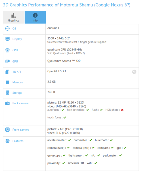 Grazie ai colleghi di HDBlog veniamo a conoscenza delle specifiche complete del nuovo top di gamma Google, il nuovo Motorola Nexus (nome in codice Motorola Shamu) potrebbe non avere più segreti dal punto di vista hardware se le specifiche venissero confermate. Tramite GFXBench veniamo a conoscenza che si tratta di un device da 5,2” con risoluzione (purtroppo) QHD accompagnata da processore Qualcomm, una GPU Adreno 420 e fotocamera da 12 MPx in grado di registrare video in 4K. Rimangono in dubbio la batteria che crediamo sarà minimo una 3000mAh necessaria per coprire appena una giornata con un display con una risoluzione così esagerata.